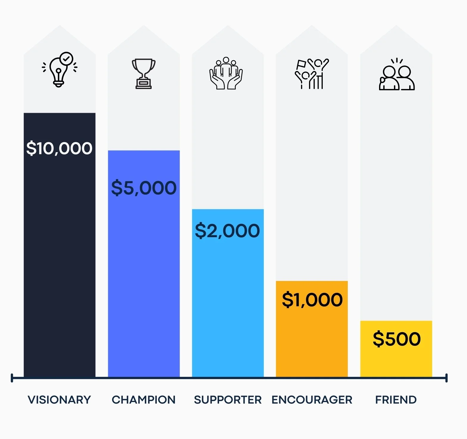 VISIONARY: $10,000 In gratitude, we will acknowledge your support on our website, on our presentations and as a sponsor on our events . We will send over our logo for you to use.